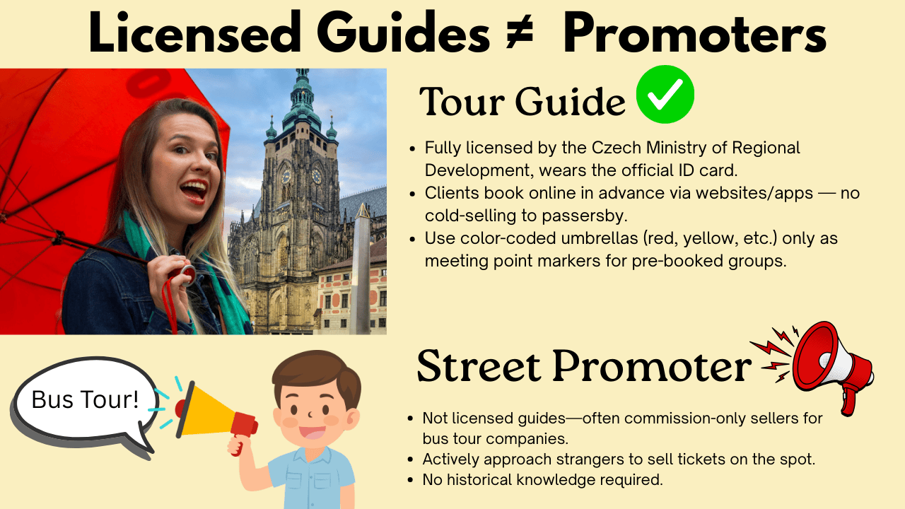 This confusion harms Prague's walking tours and paid licensed guides, who never solicit on streets but meet pre-booked clients under color-coded umbrellas (like our red ones at Real Prague Guides).